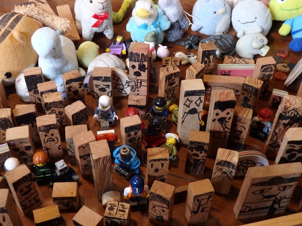 「ドミノ王国」 息子とその友人の作るファンタジーの世界。 話しに終わりがなく住人はどんどん増えていきます。 いつまで続くのか、いつまでも続いてほしい。 この町の話し声が僕の仕事中のBGMです。 |