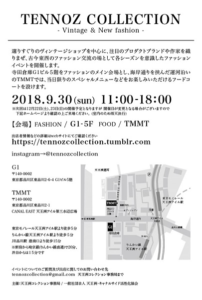 ヴィンテージファッションのイベントに出店いたします。 天王洲アイルの寺田倉庫が会場です。 皆さまのお越しをお待ちしております。 日時 : 9月30日(日)11:00〜18:00 場所:寺田倉庫G1 アクセス: りんかい線天王洲アイル駅より徒歩約5分 JR品川駅港南口より徒歩約15分 東京モノレール天王洲アイル駅より徒歩約5分 新宿から埼京線(りんかい線直通)で20分、渋谷から15分 TENNOZ COLLECTION |